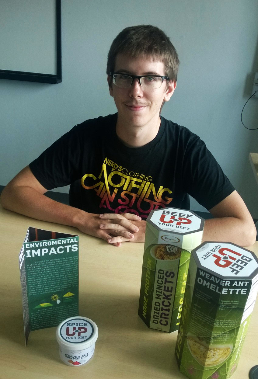 Matthew : Wow, I think saving the world is a tall order, but I think that design definitely contributes. In my case, I think my project would have many benefits if it were implemented. There are many issues that entomophagy would combat. By the year, 2050, it is estimated that the world will have a population of nine billion people. Supporting those kinds of numbers with our current agricultural system is nearly impossible. Entomophagy would help ease the stress of feeding the rising population. Also, it is said that agriculture is the leading contributor to greenhouse gas emissions. Traditional livestock requires vast amounts of land and resources, and it often contaminates water resources. Insects, on the other hand require very little land and resources and greenhouse gas emissions are minimal. Here is an excellent illustration of what I’m talking about: