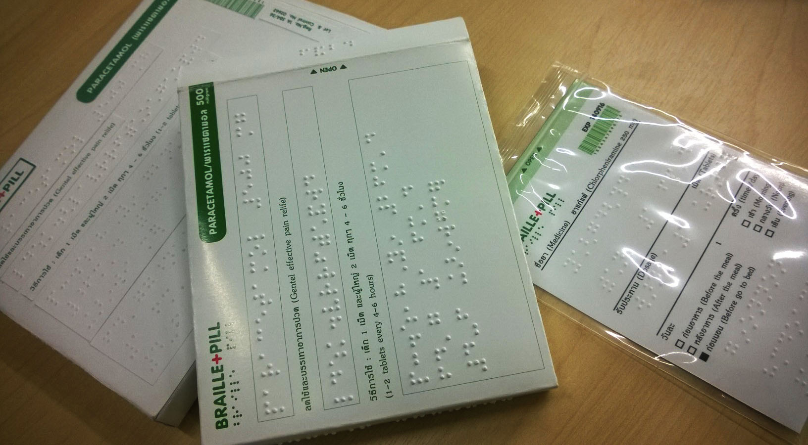 Gigg: Yes, first I went to the foundation of the blind in Nakornpathom and I conducted and recorded qualitative interviews. Many blind people told me that they cannot imagine shapes, even if non- impaired people try to explain them. Blind people don’t read symbols, but they understand Braille code for Thai language. The sensation of touch is the most important. After interviewing, I started my research. I created the first prototypes of my packaging design which included a Paracetamol box, as well as the pharmaceutical label for the clinic and hospital. The design should assist blind people to live their life independently and as easy as non-visually impaired people.