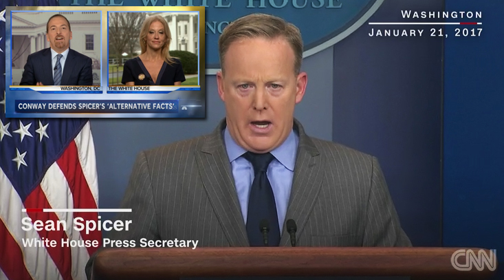 Image: Kellyanne Conway, counselor to President Donald Trump (top) officially established ‘alternative facts’ (‘doublespeak’) in January 2017 in a blunt rejection of empirical facts when she denied the low attendance during President Trump’s inauguration. Her interpretation was reinforced by Sean Spicer, the White House Press Secretary (Source: NBC/ CNN)