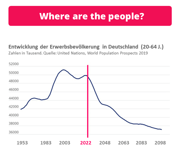 Der Aufhänger unsere Pitches von NEXTGEN.LX bei unserer ersten öffentlichen Präsentation war die stetige Abnahme der Erwerbsbevölkerung in Deutschland in den nächsten Jahrzehnten. Laut dem statistischen Bundesamt überschreiten fast 13 Millionen Erwerbspersonen bis 2026 das Renteneintrittsalter. Das entspricht knapp 30% der dem Arbeitsmarkt zur Verfügung stehenden Erwerbspersonen. Diese werden kaum von nachrückenden jungen Menschen ersetzt.