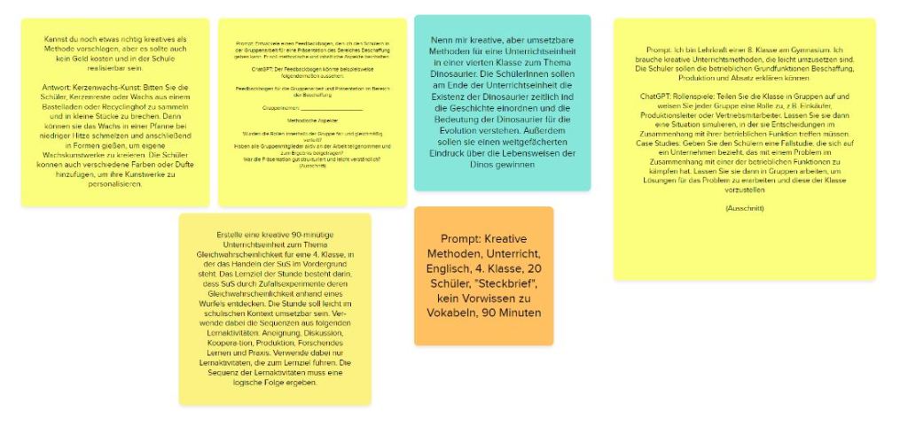 Die Idee war ebenso genial wie praktisch. Und es ging sehr schnell, da GPT vorhergehende Antworten, anders als Suchmaschinen, im Gedächtnis behält. Meine Studierenden fanden schnell heraus, dass sich längere Texteingaben ebenso durch Stichworte ersetzen lassen, beispielsweise ‚Kreative Methode, Unterricht, Englisch, 4. Klasse, 20 Schüler, “Steckbrief”, kein Vorwissen zu Vokabeln notwendig, 90 Minuten.‘